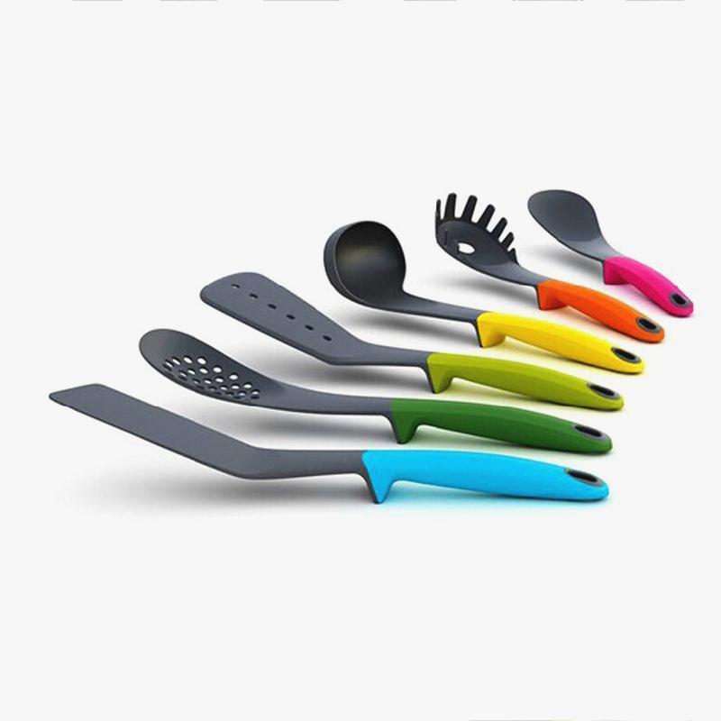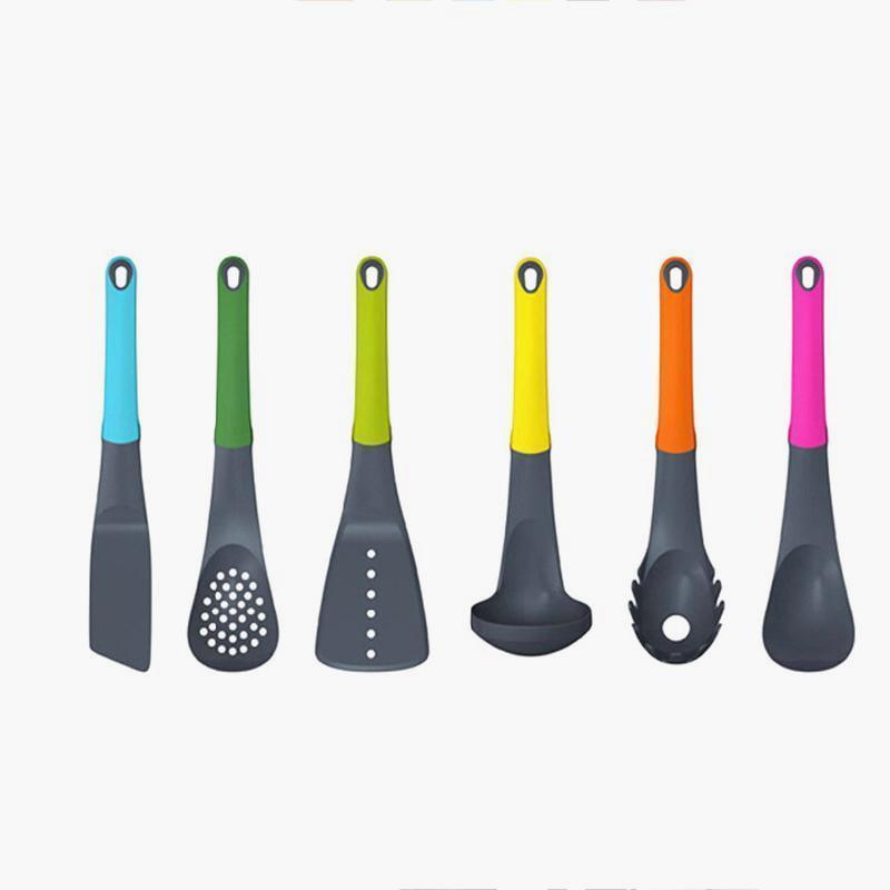 Ensemble de 6 outils de cuisine essentiels: spaghetti , cuillère à fente, louche, tourne-vis à fentes, cuillère solide et retourneur flexible , 1 stand de carrousel