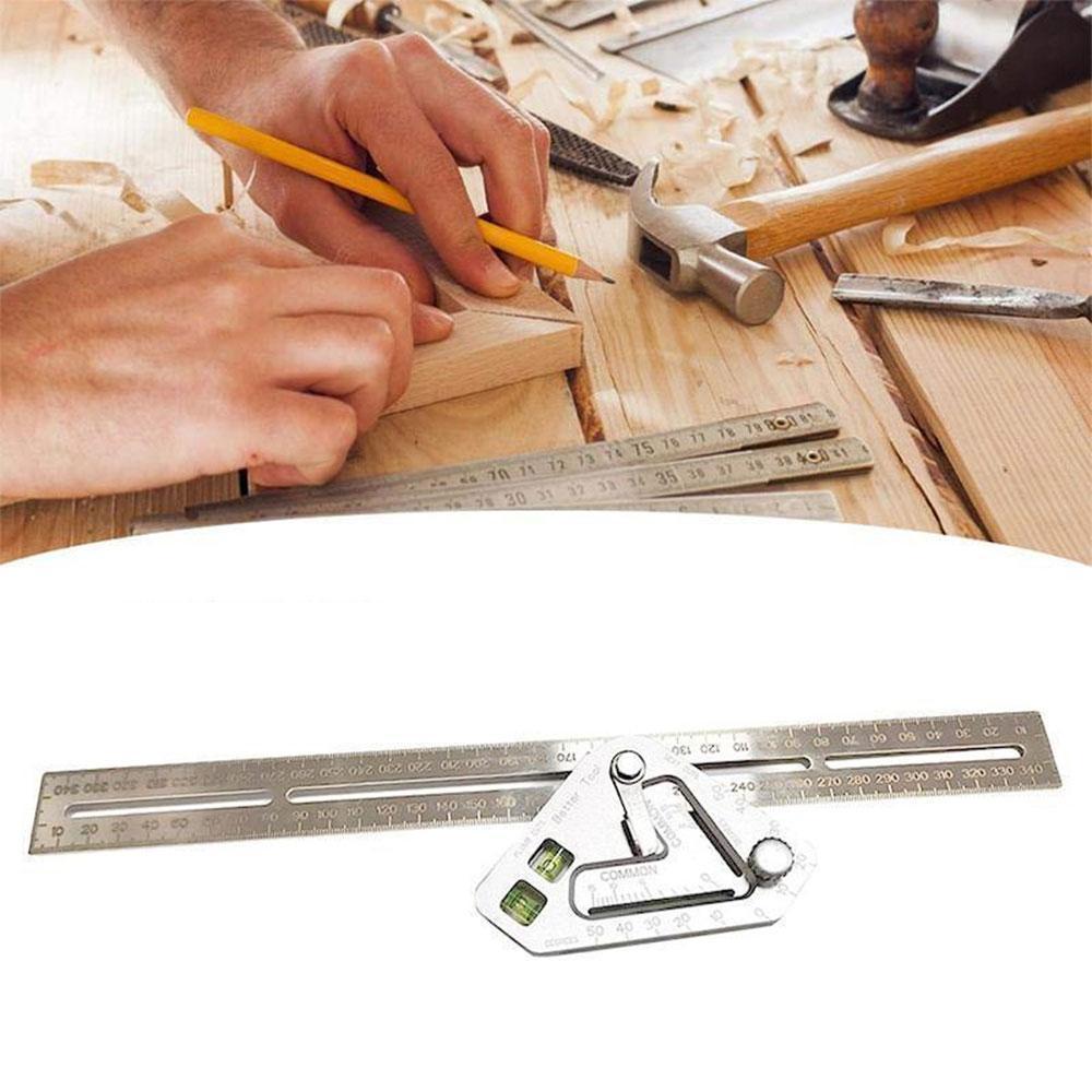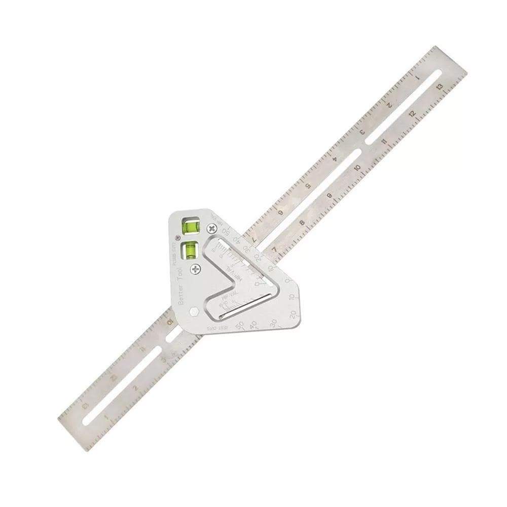 Le verrou carré peut être engagé pour compléter un carré combiné avant de verrouiller la profondeur de la lame avec le verrou de lame. Le bord extérieur avant comporte une échelle en degrés, plus une échelle de montée / descente traditionnelle placée dans la face avant. Le dos est calibré pour les coupes de hanche et de vallée, avec des échelles angulaires calibrées avec chacune des échelles avant.