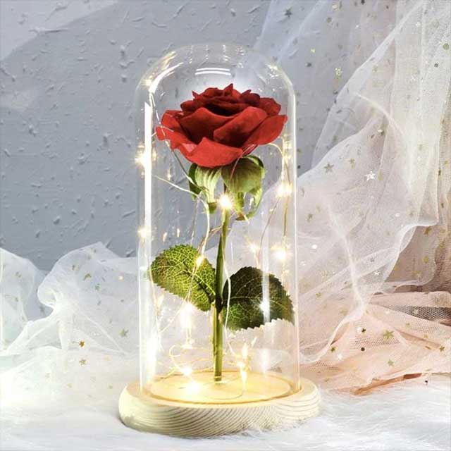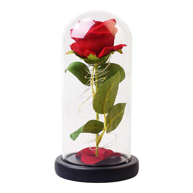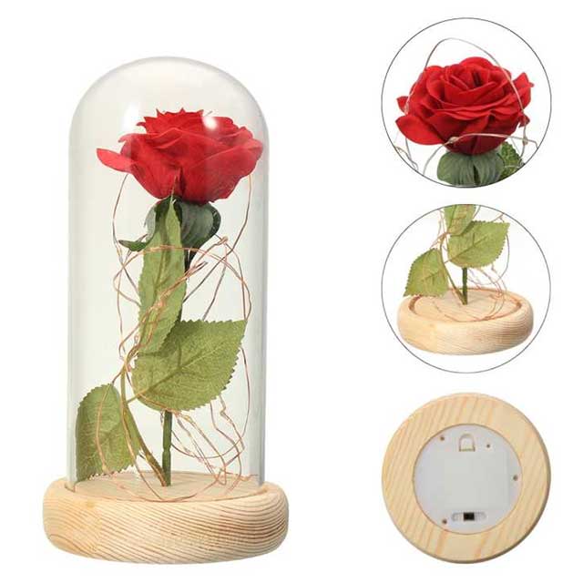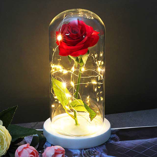 Cette rose est enveloppée d'une bande LED blanc chaud alimentée par 3 piles AAA, durable et résistante à la chaleur. Les minuscules LED sont encastrées dans les pétales, de la rose aux pétales tombant sur la base, la lumière blanche chaude éclaire tout le dôme et même les choses environnantes. La lumière blanche chaude ne profite pas seulement à nos yeux, mais elle nous donne aussi une atmosphère romantique. Surtout un dîner romantique aux chandelles.