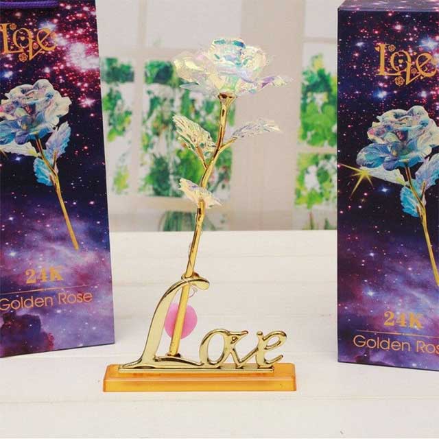 Chaque rose est fabriqué à partir de matériaux de grandes qualités. Dorée, sa tige emmène cette rose galaxie à une hauteur de 25 centimètres. Ses pétales sont à couper le souffle, d'une couleur indescriptible et unique, elles reflètent la lumière.