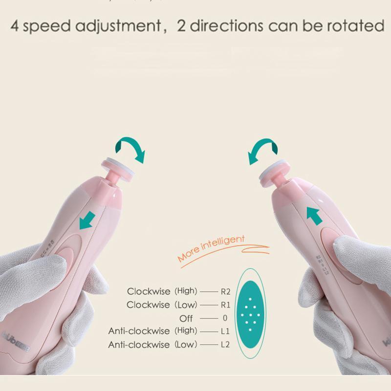 Le coupe-ongles contient 6 têtes de meulage interchangeables, 3 sablières matelassées pour bébés et enfants, ainsi que 3 accessoires pour adultes. 4 modes de fonctionnement, double vitesse, inverse et dans le sens des aiguilles d'une montre pour répondre aux besoins des différentes étapes de l'ongle.