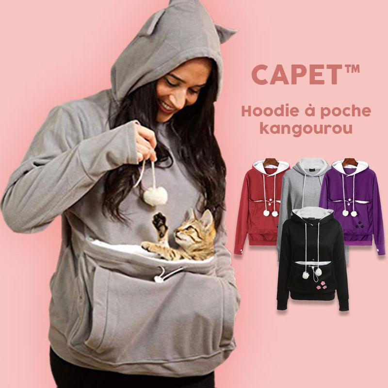 CAPET™ n'est pas fait seulement pour vous réchauffer, mais aussi pour votre adorable animal de compagnie. Vous pouvez le placer sur la pochette de votre sweatshirt à capuche. C'est très apaisant de dormir avec vos animaux de compagnie allongés sur le ventre avec leur silhouette paisible et endormie.