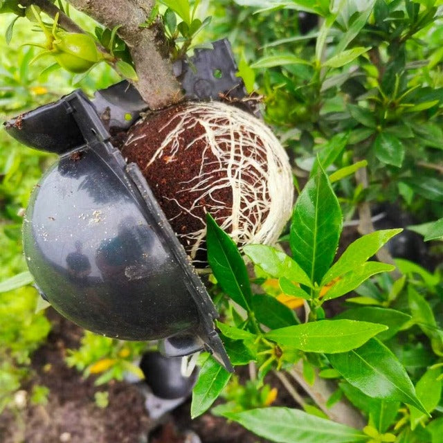 Les boules d'enracinement possèdent 4 bouchons et des verrous d'angle qui s'emboitent les uns avec les autres. Il vous est aussi possible d'utiliser des attaches en plastique pour le maintient des boules d'enracinement sur la branche.